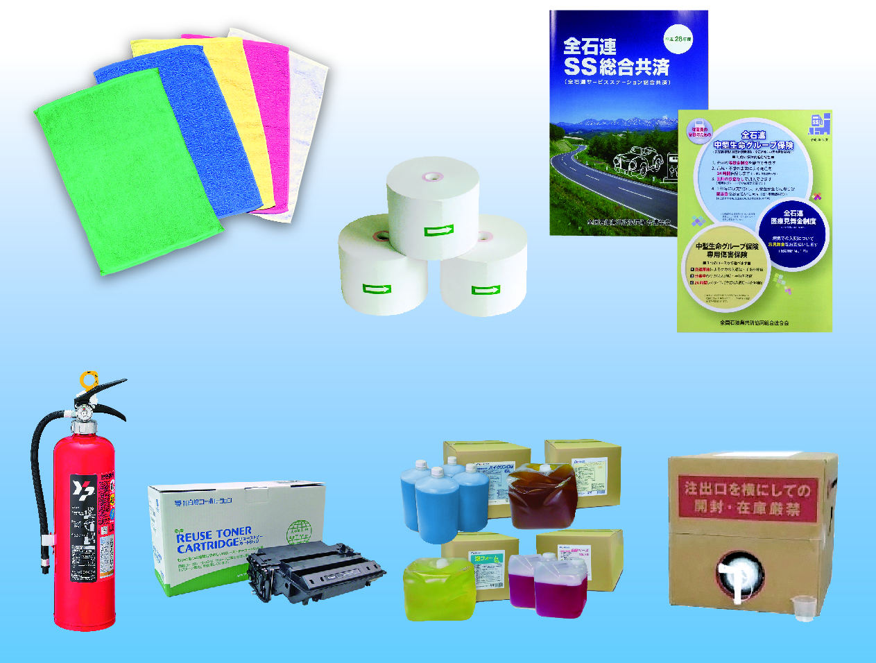 全石連の共同事業は、組合員を対象として共同購買グループにてSS運営に必要な洗車用タオル・ロール紙・消火器やタオル用液体洗剤など良質な商品を安価で提供しています。