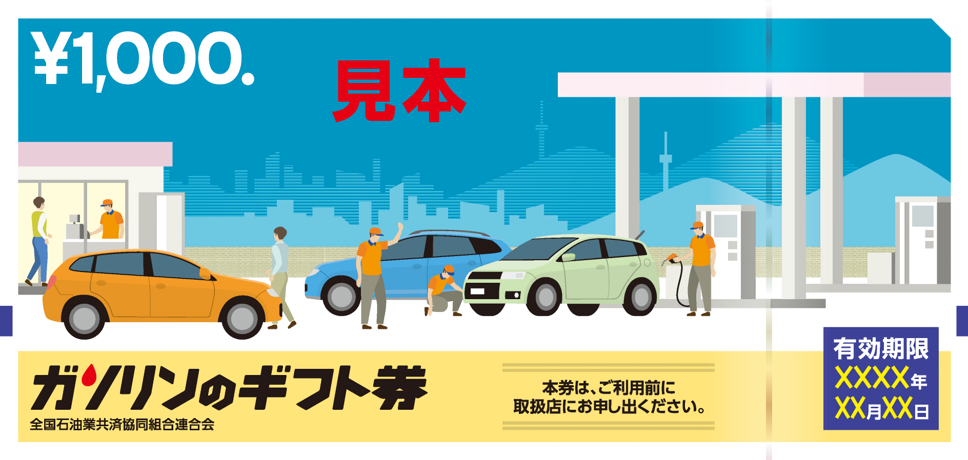 SSで提供している商品(ガソリン、軽油、灯油、タイヤ等)、サービス(洗車、オイル交換など)に使える「ガソリンのギフト券」を20都府県で販売しています。