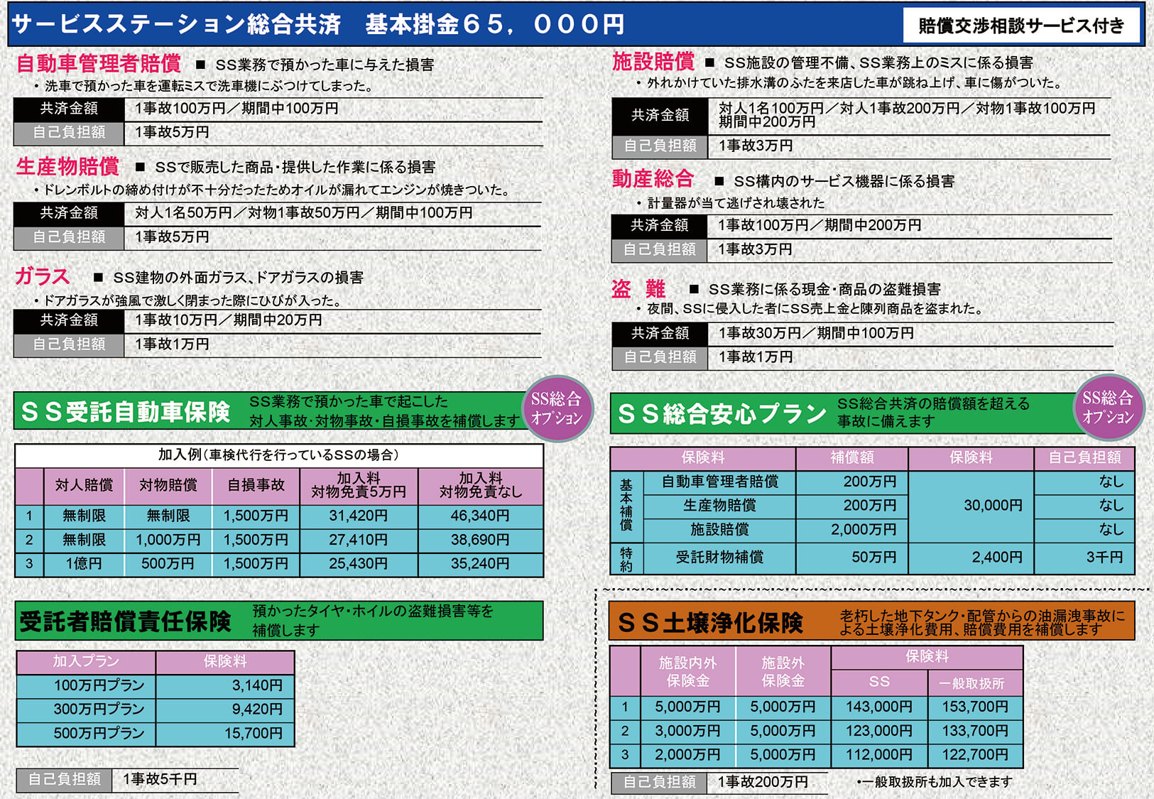 また、共済・保険斡旋グループでは企業の福利厚生制度として活用できる「中型生命グループ保険」、日常生活の安心もサポートする「安心医療保険」・「SSパート・アルバイト傷害プラン」、SSで発生する賠償事故に備える「SS総合共済」、老朽化した地下タンク・配管からの漏油事故に備える「SS土壌浄化保険」などの共済・保険を提供してSSをサポートしています。