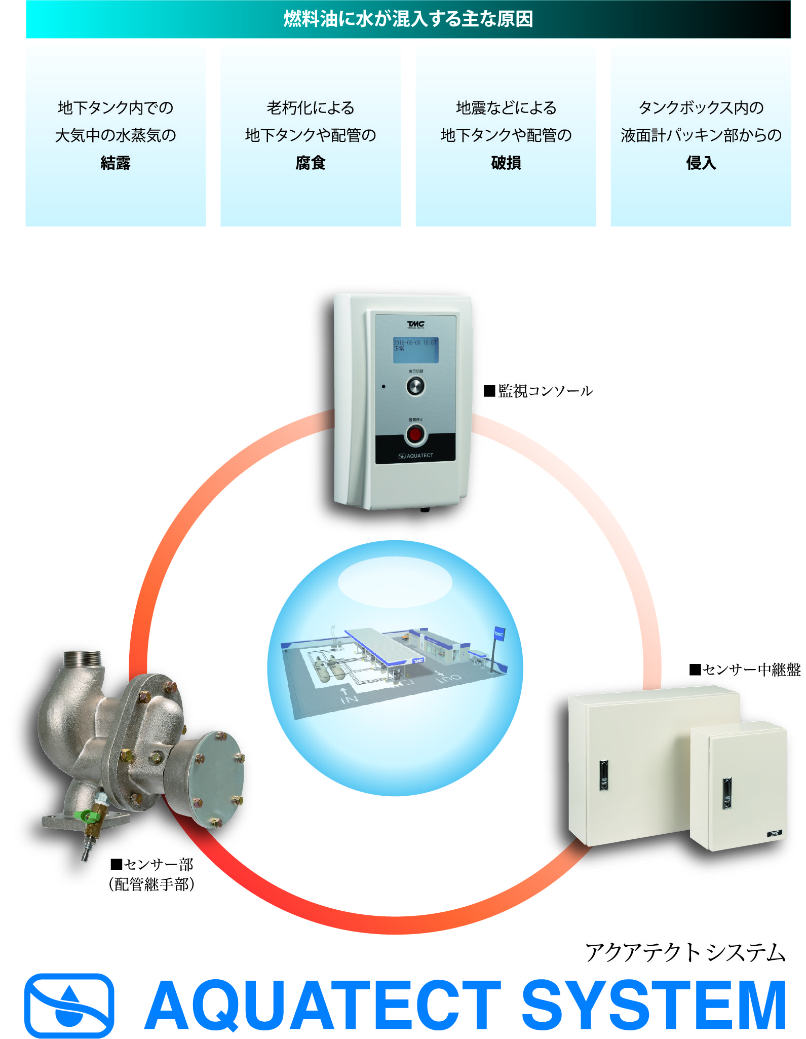業界初となる「配管水検知システム(AQUATECT SYSTEM)」は、配管内に侵入した水を検知し給油による車両への水混入を防ぐ、業界初のシステムです。計量機ピット内の立ち上がり配管にセンサー部を設置し、給油時の水混入事故を未然に防ぐことができます。